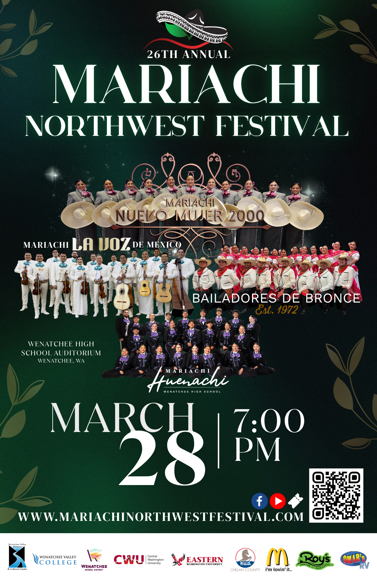 El Mariachi Northwest Festival está agradecido de ver cómo el Valle de Wenatchee continúa apoyando y adoptando la hermosa cultura y tradición de la música de Mariachi. Sin el apoyo continuo de empresas locales, universidades y voluntarios, este festival no sería posible. Estamos orgullosos de brindar estándares superiores para el enriquecimiento musical a los estudiantes de todo el noroeste del Pacífico y nos sentimos honrados de brindar esta experiencia musical cultural excepcional a nuestra comunidad.